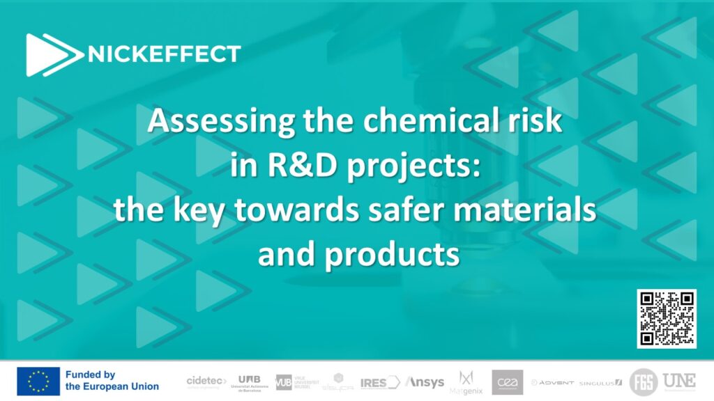 In NICKEFFECT, chemical risk assessments will be carried out throughout the project life cycle, from the laboratory-scale production to the material testing and validation, including production ramp-up, demonstrators and valorisation activities. The products involved in each process are identified and listed in an inventory. Their associated hazards are assessed, and the use of each hazardous product is then analysed to evaluate the exposure conditions. Finally, the risk is prioritized according to the impact on health, on the environment and the risk of fire and explosion for each action of each process. Once the assessments have been carried out and priorities established, recommendations are made to mitigate the risks, in combination with the findings and recommendations from life-cycle analysis and life-cycle costing.