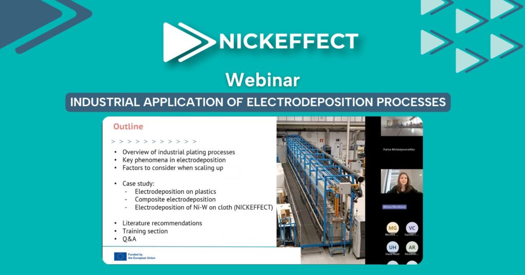 NICKEFFECT recently hosted a highly insightful webinar titled “Industrial Application of Electrodeposition Processes,” providing a comprehensive look into the practical aspects and innovative potential of this critical technology. Held on May 26th at 10:00 CET, the session successfully brought together professionals, researchers, and individuals keen on understanding the transition of electrodeposition from laboratory research to industrial implementation. The webinar was expertly led by Dr. Aliona Nicolenco, NICKEFFECT Project Coordinator and Senior Researcher at CIDETEC Surface Engineering. The session was organised by project partner VUB.