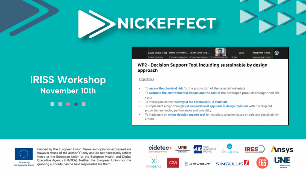 This workshop featured presentations from IRISS, the Joint Research Center (JRC), the NanoSafety Cluster (NSC), and PARC, providing insights into the SSbD framework, the evolving SSbD roadmap at IRISS, and the ongoing development of the SSbD toolbox at PARC. Joséphine Steck, Chemical Risk Engineer and SSbD Project Manager in CEA, was present at the Workshop, as representative for NICKEFFECT’s Work Package focused on “Decision Support Tool including sustainable by design approach”.