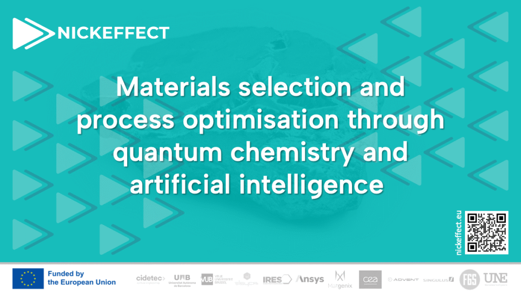 Materials selection can be greatly accelerated through quantum chemistry and artificial intelligence. New chemistries and atomic arrangements can be explored at the atomic scale using state-of-the-art techniques such as molecular dynamics and density-functional theory. These can be used to predict materials’ properties without relying on experimental parameters, making them choice tools for characterizing new Ni-based (electro)catalysts, or the magnetic properties of Ni-based alloys for digital storage. This is particularly interesting when many compounds need to be tested (e.g., with various atomic compositions) which is a very long and costly task to handle experimentally. Indeed, a virtual screening of the possible compounds can therefore be performed first, so that only the best materials need to be synthesized and tested experimentally.
