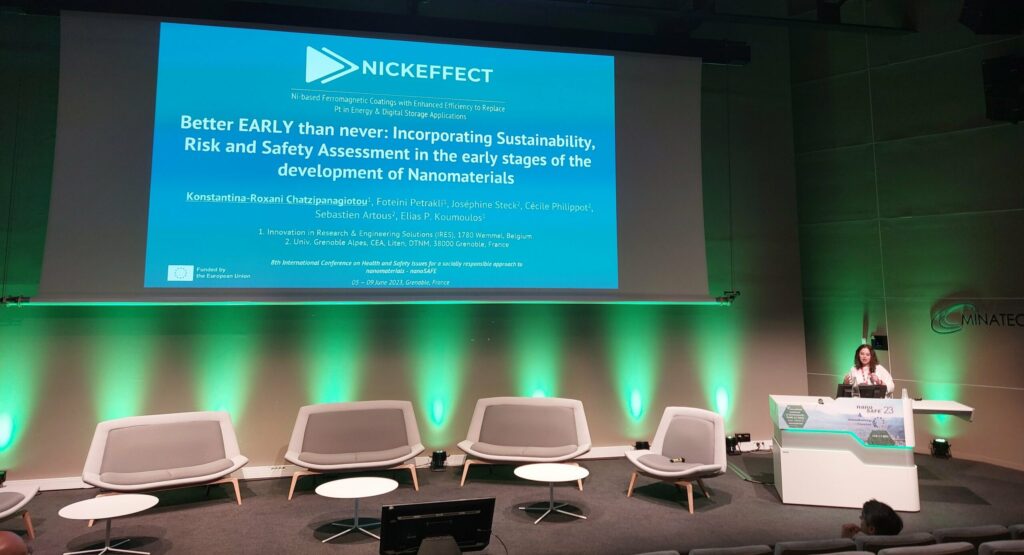 During the conference, K. Chatzipanagiotou of IRES presented the NICKEFFECT project, offering insights into the research methodology and the progress made so far. The presentation showcased the utilisation of open-access tools to estimate the early-stage risk and sustainability of metal nanocatalysts. While the project’s material development is ongoing, the research team presented literature-based results to illustrate the potential applications of these tools.