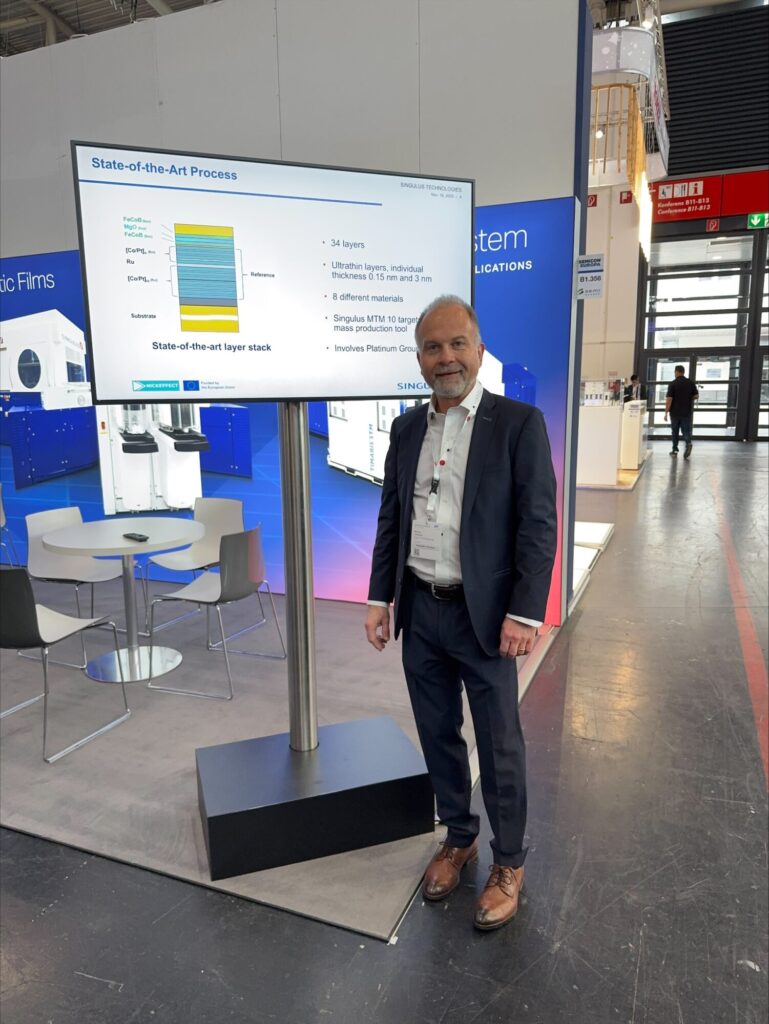 A key feature at the Singulus stand was the dissemination of the latest results on Platinum (Pt)-free, non-volatile MRAM stacks developed within the NICKEFFECT project. These results are aligned with the project’s mission to reduce Europe’s reliance on costly and critical raw materials by developing novel, high-efficiency, Ni-based coating solutions.