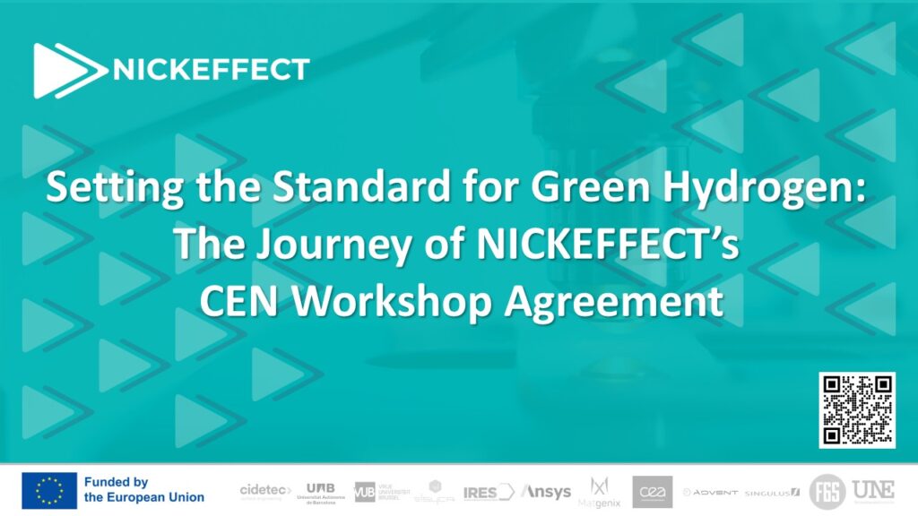 The NICKEFFECT project has successfully bridged the gap between laboratory research and industrial application with the publication of CWA 18302:2026, a landmark CEN Workshop Agreement developed in collaboration with CEN-CENELEC. This document establishes the first harmonized European protocol for the electrochemical characterization of non-noble, porous metal-based electrodes for hydrogen generation in acidic media. By standardizing testing cells, activity parameters, and data reporting, this success story—led by CIDETEC, the Spanish Association for Standardization (UNE), and project coordinator Aliona Nicolenco—provides the scientific community with a critical tool to accelerate the development of cost-effective, PGM-free water electrolysis technologies, ensuring that early-stage material innovations can be reliably benchmarked and scaled for a net-zero future.